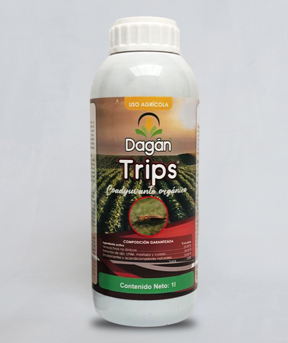 Dagan Trips® es un cuadyuvante orgánico con una formulación sinérgica única capaz de romper las capas cerosas de los insectos. Se distingue por el poder de repelencia hacia los trips, ya que su ingrediente activo en mezcla tiene el poder de matar al insecto desde la primera aplición. Este producto es de contacto y actúa de manera muy rápida. Los ingredientes activos son extracto de ajo y canela, que producen irritabilidad e hiperexcitación en el sistema nervioso del insecto, impidiendo su preproducción y movimiento. El extracto de cuasia y mostaza actúan de contacto provocando la muerte al instante.